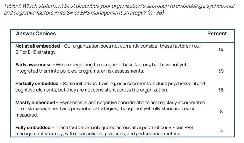 However, when asked how well those factors are actually embedded in their EHS programs, the picture shifted dramatically. Only 3% said psychosocial and cognitive factors are fully integrated into their management systems. Just 8% said mostly integrated. The remaining 89% said these factors were either not embedded at all or only partially present across the organization.