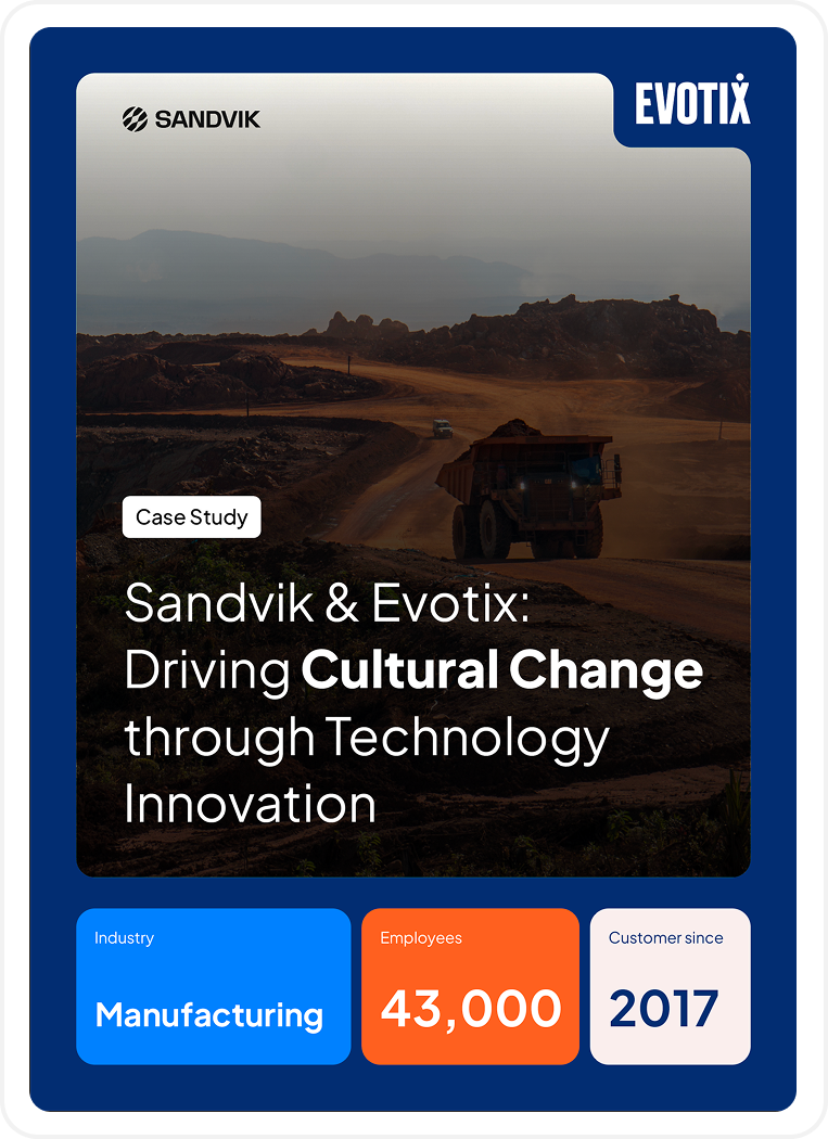 Evotix gave Sandvik Mining and Rock Solutions the flexibility to adapt EHS processes to a wide range of operational environments and maturity levels across its global mining portfolio. By moving beyond spreadsheets to a configurable, unified platform, Sandvik achieved clearer visibility, stronger participation and a more consistent way to turn reporting into informed action. This adaptability helped frontline teams engage more confidently, supported leaders in driving accountability and enabled the organisation to advance the long‑term EHS mindset it had been working toward.